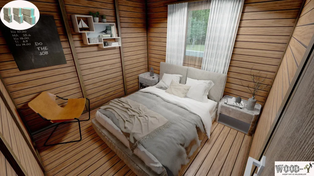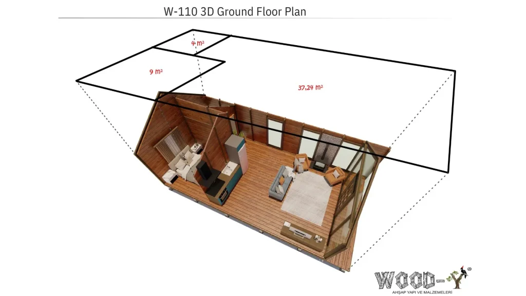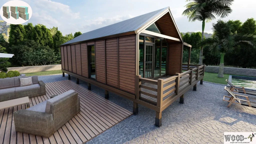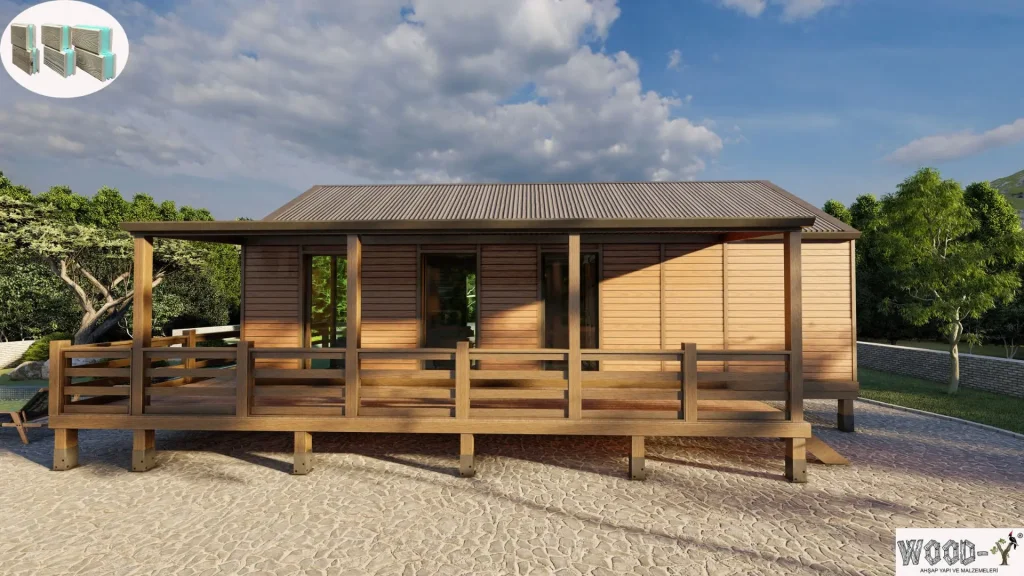 *The veranda is optional, allowing you to customize it according to your needs. With its modern and practical design, this bungalow offers both a natural living experience and comfort. Contact us today to find the wooden house model that best suits your needs!