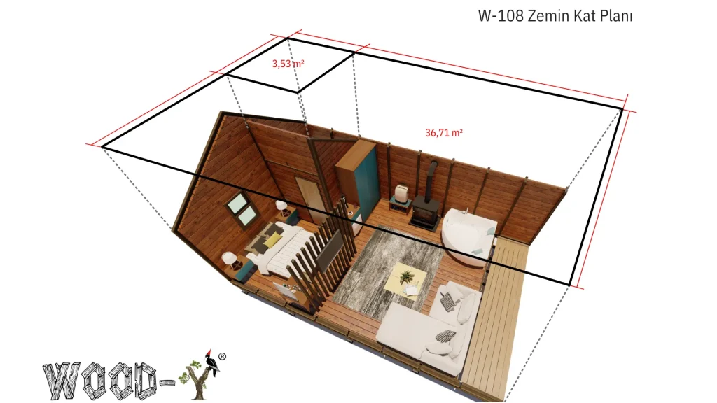 Zemin katta yer alan banyo (3,53 m²) ve yatak odası, günlük ihtiyaçlarınızı en iyi şekilde karşılayacak şekilde tasarlanmıştır. Bu model, hem estetik hem de kullanım kolaylığı açısından ideal bir tercih sunar.